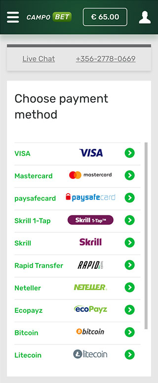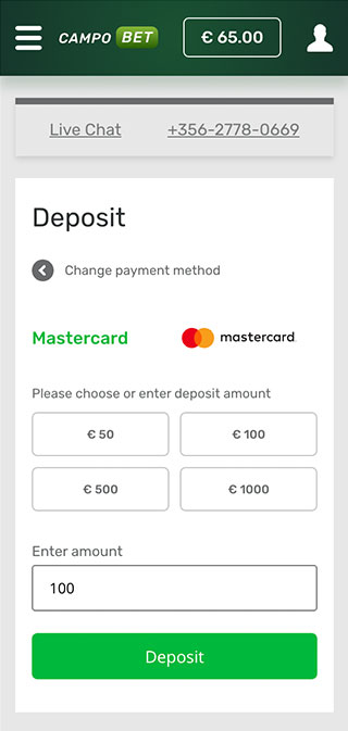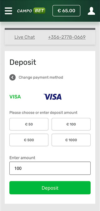 No matter what page of CampoBet casino you are on right now, you can always access your balance by clicking on the corresponding sign displayed in the upper right corner of the screen. You will end up on a page with all your financial details. Here you can make all kinds of money operations, including deposits and withdrawals.