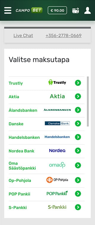Lunastaaksesi CampoBet ensitalletusbonuksen, sinun tulee rekisteröityä ja tehdä ensitalletuksesi. Rekisteröitymisen jälkeen paina valuuttamerkin kuvaa oikeassa yläkulmassa ja valitse maksutapasi. Minimitalletus voi vaihdella, joten tarkista se vielä Käyttöehdoista.