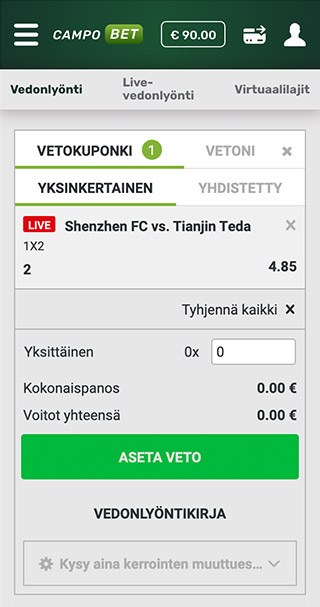 Seuraavaksi voitkin aloittaa vedonlyöntimatkasi. Bonuksen saamiseksi talletus on panostettava kokonaisuudessaan vähintään kerran. Voit asettaa single- tai yhdistelmävetoja missä tahansa lajissa min. kertoimin 1.50.