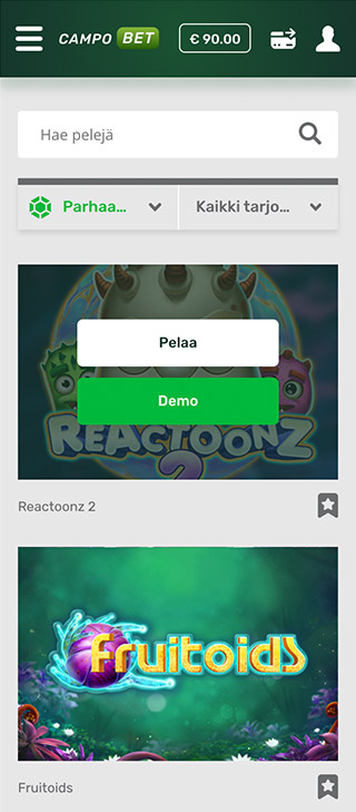 Voit myös valita pelaatko huviksesi vai oikealla rahalla. Pelin kohdalla oleva vihreä nappi vie sinut ilmaiseen demotilaan. Voit tutustua pelien mekaniikkaan siis riskittömästi. Mutta jos haluat voittaa käteistä, kannattaa tietenkin siirtyä pelaamaan oikealla rahalla.