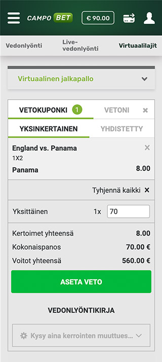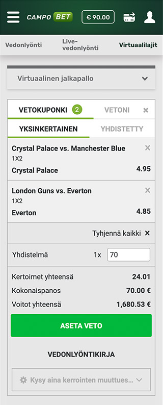 Kun olet päättänyt, mitä lajia haluat kokeilla, avaa sitä vastaava välilehti. Voit esimerkiksi lyödä vetoa Virtuaalisesta Valioliigasta. Oikeassa liigassa joukkueet pelaavat ehkä kerran viikossa, mutta tässä CampoBetin osiossa kohteita on tarjolla joka päivä ja koko ajan.