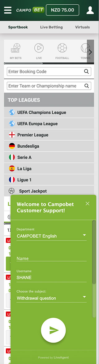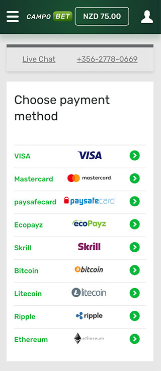 In order to receive this CampoBet casino bonus, you should sign up and make your first deposit. After completing the registration, you click on the currency field in the upper right corner and choose the preferred payment method. The minimum deposit amount may vary in the course of time, so it’s better to check it in the Terms and Conditions section.